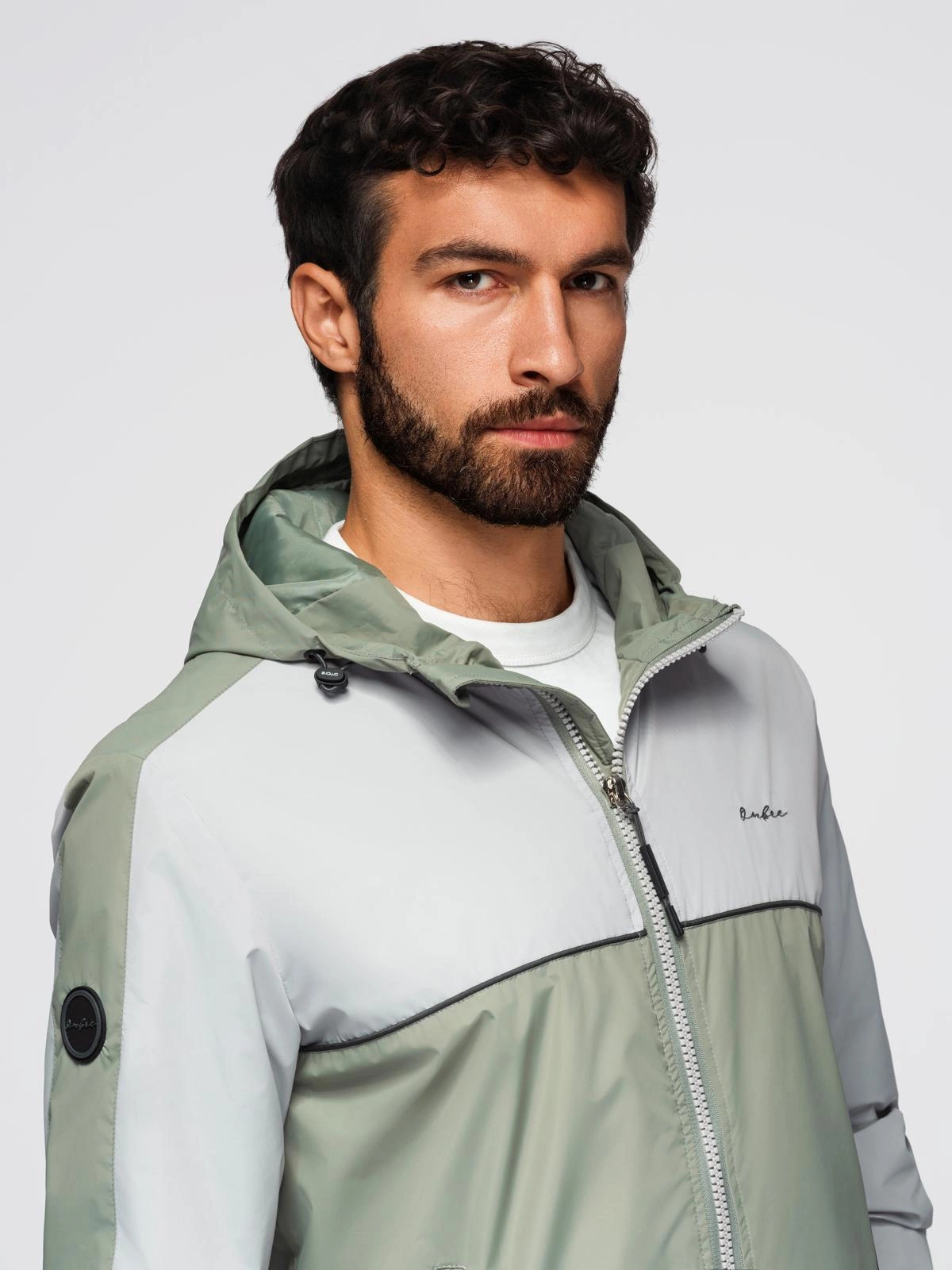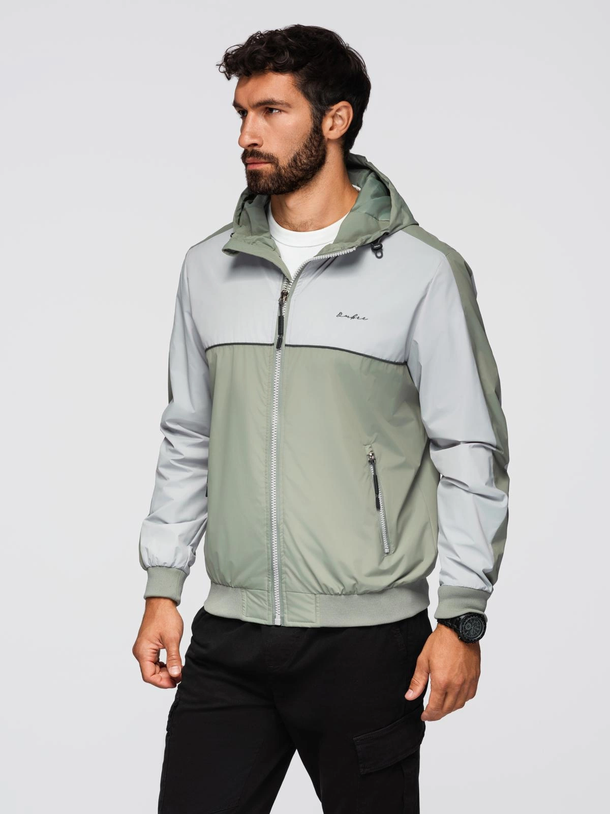 Męska kontrastowa kurtka wiatrówka z kapturem - oliwkowo-szara V3 OM-JANP-0228