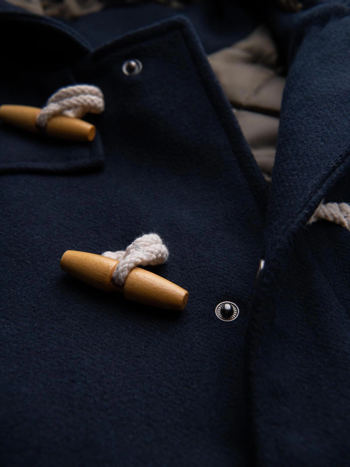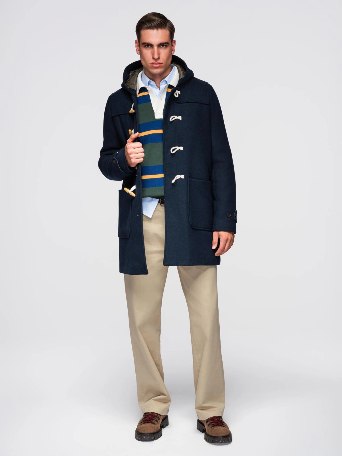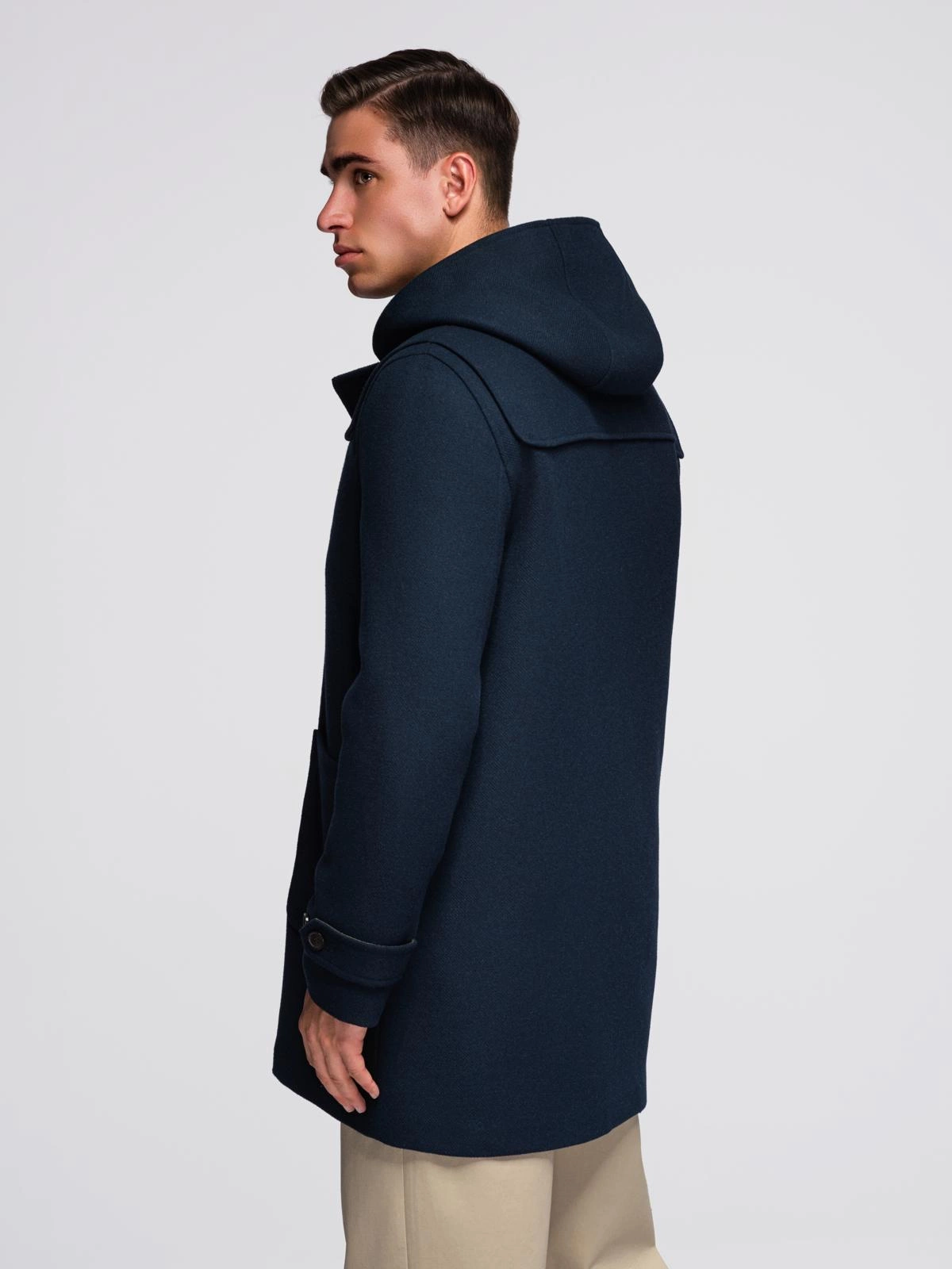 - Męski płaszcz z wełną i kapturem duffle coat – granatowy V2 OM-COWC-0131