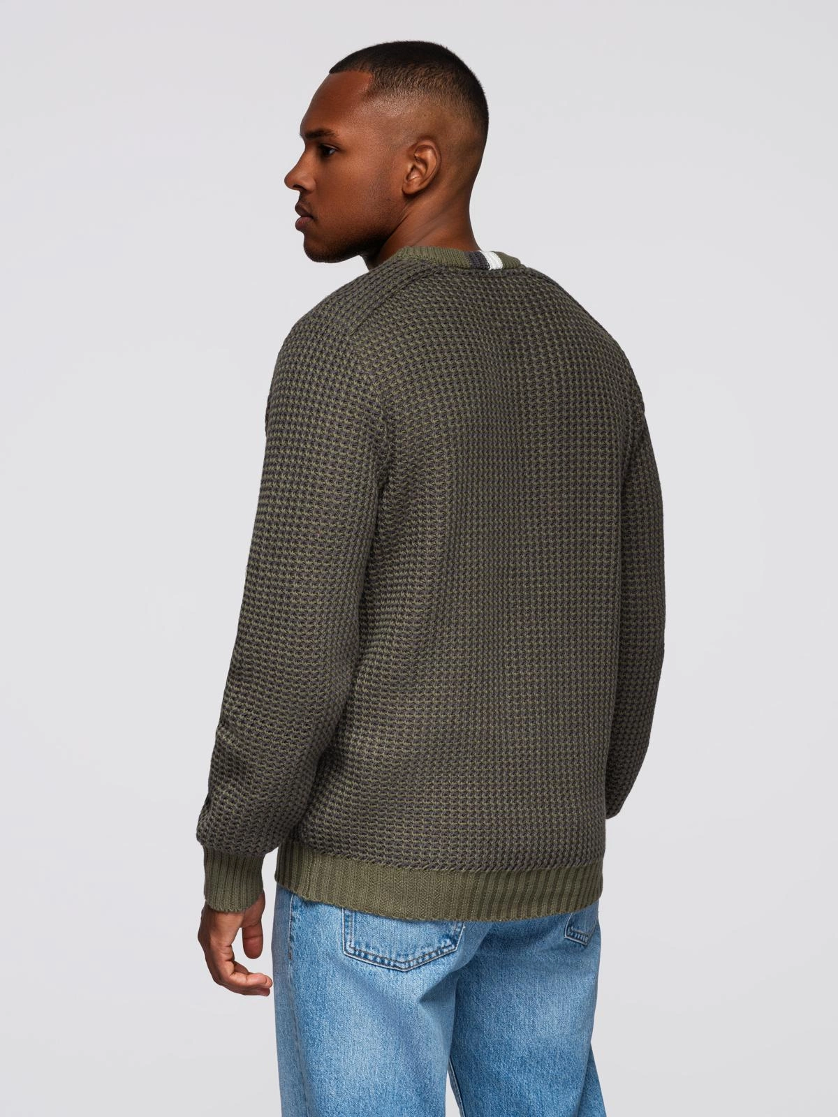 - Sweter męski o kontrastowym splocie z okrągłym dekoltem – ciemnooliwkowy V2 OM-SWSW-0122