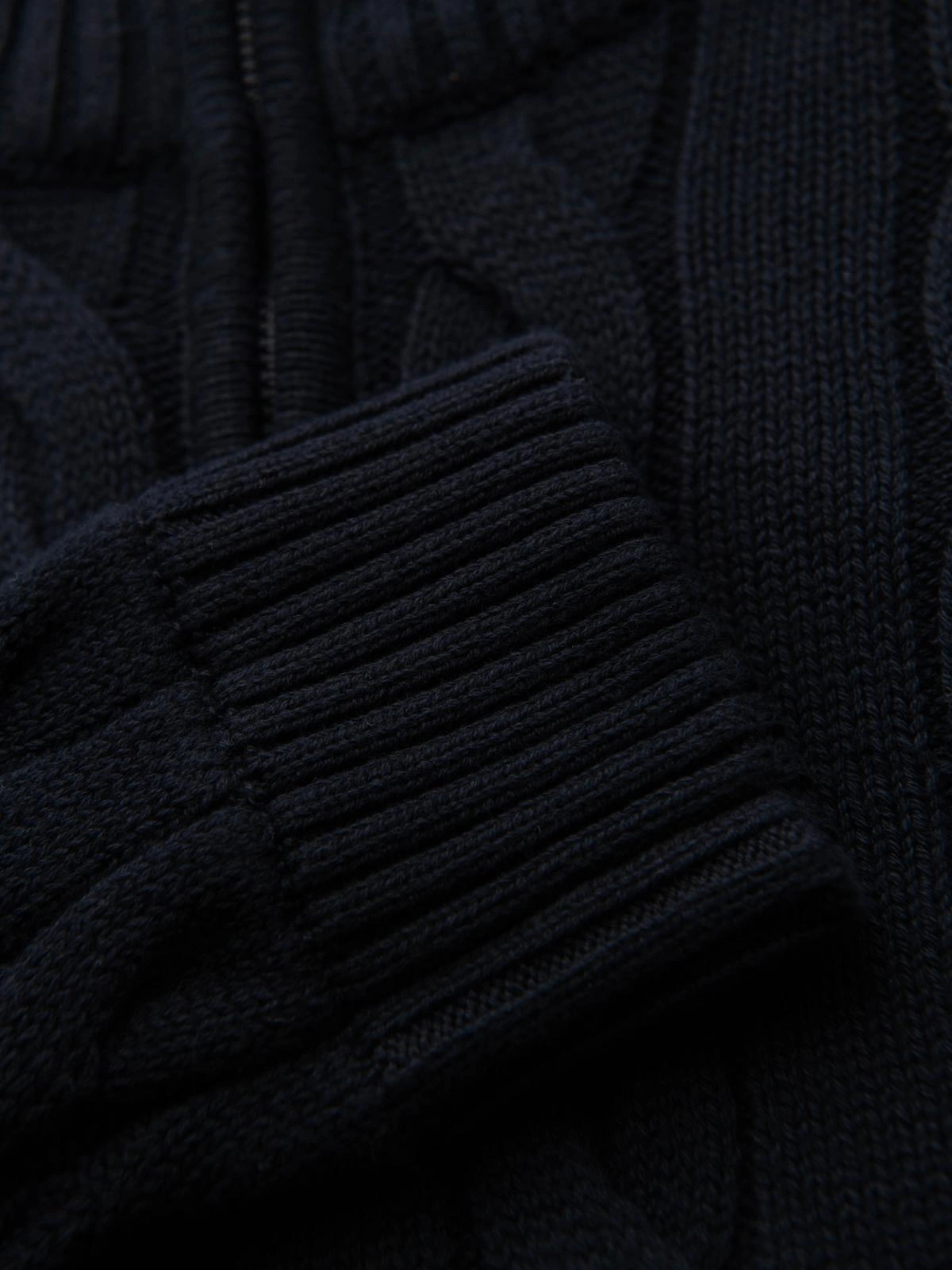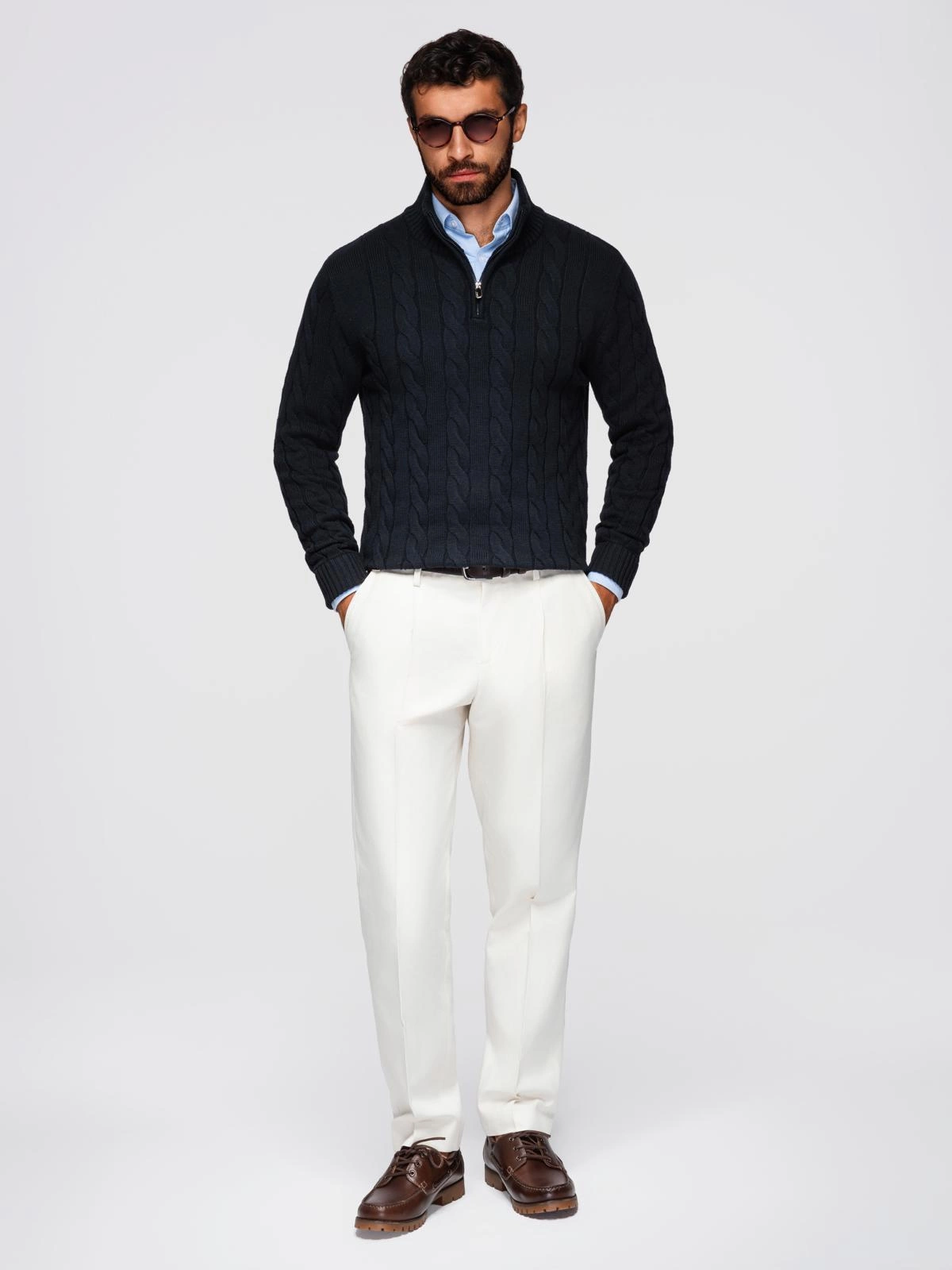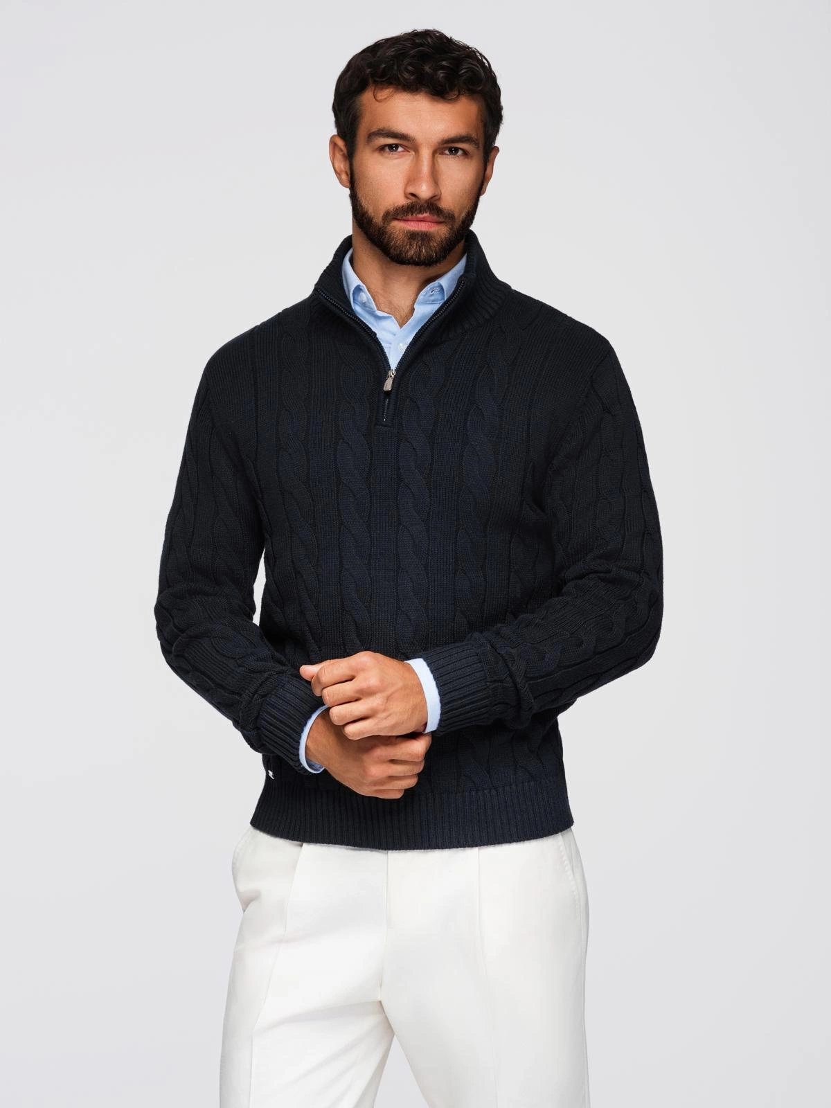 - Męski sweter o warkoczowym splocie z golfem zapinanym na zamek – czarny V2 OM-SWZS-0138