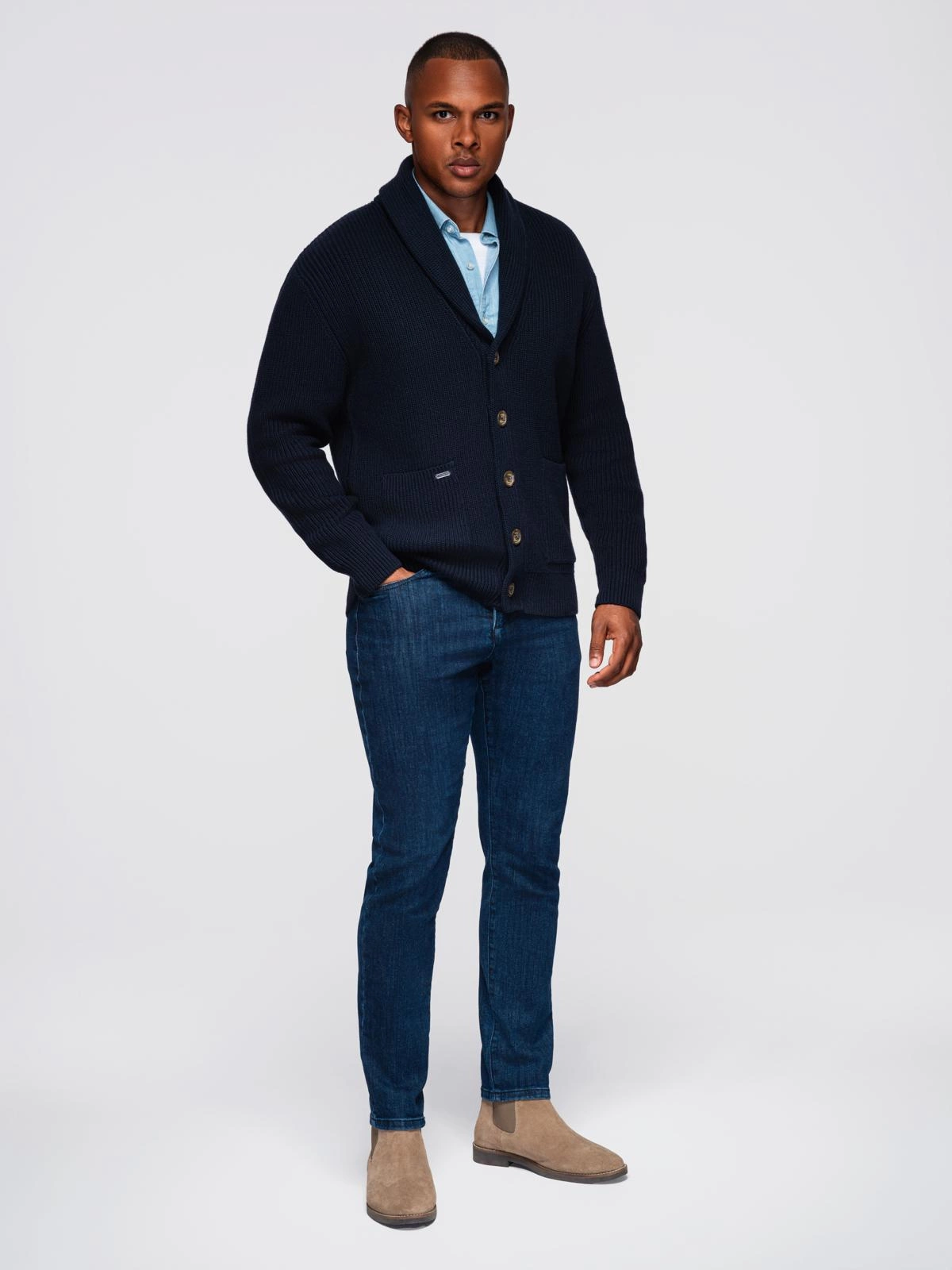 Sweter bawełniany męski kardigan z szalowym kołnierzem - granatowy V1 OM-SWCD-0153