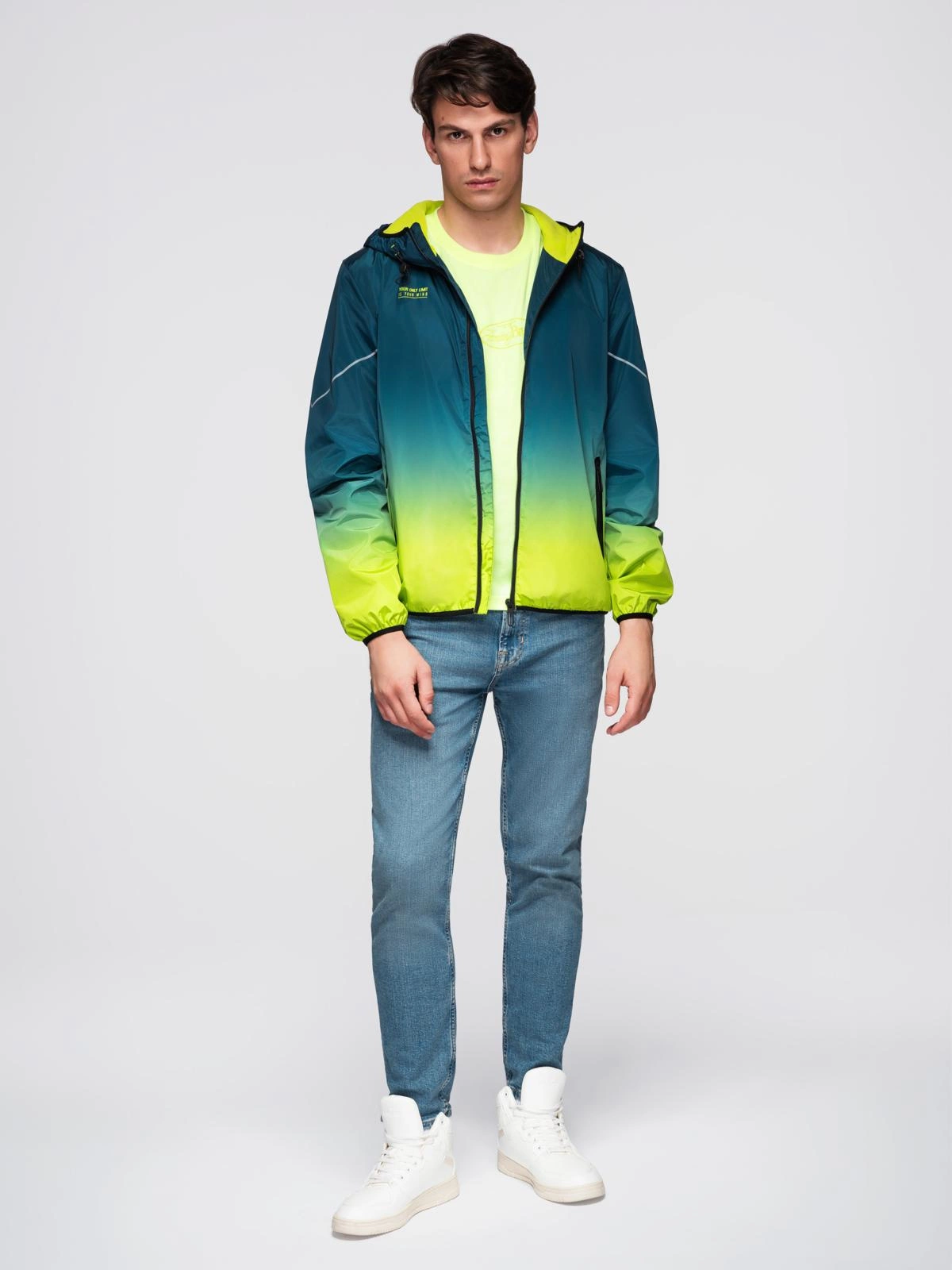Sportowa kurtka męska ombre z odblaskami i polarową podszewką – turkusowo-limonkowa V1 C641