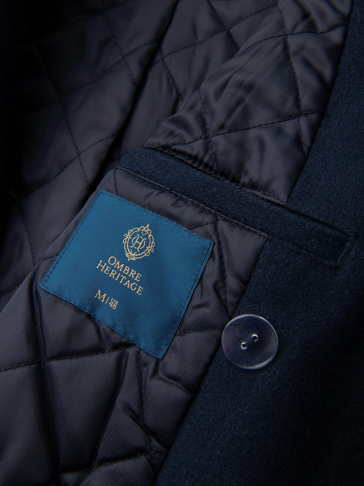 Męski dwurzędowy płaszcz z wełną oraz ozdobnymi aplikacjami - V1 granatowy OM-COWC-0149