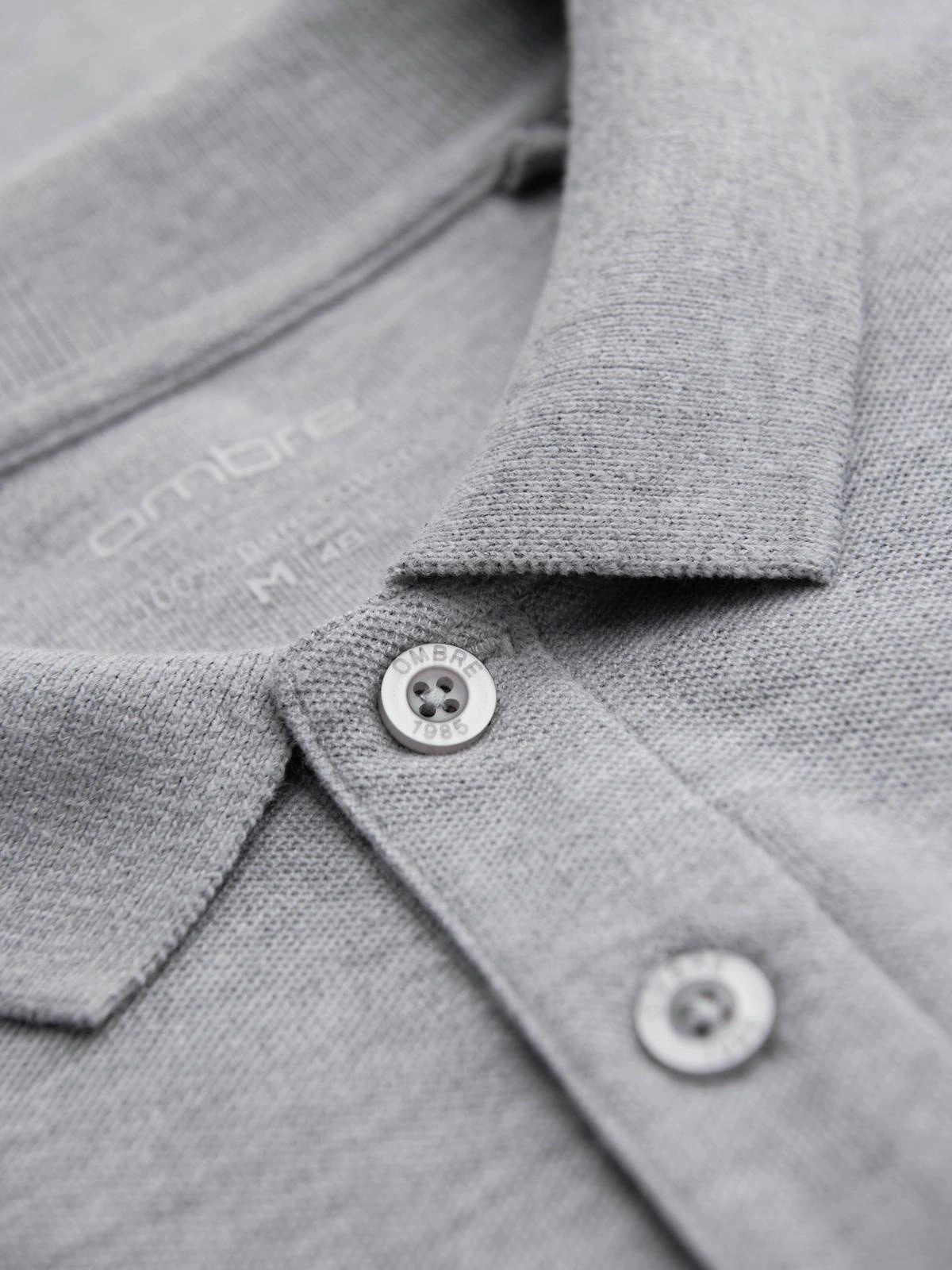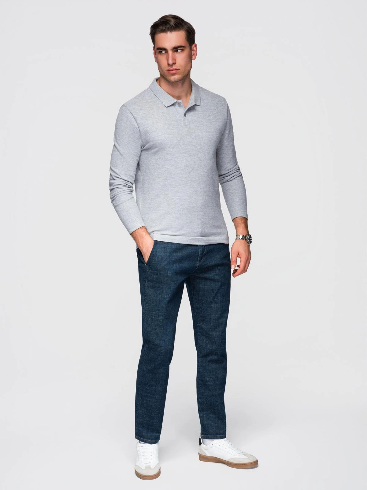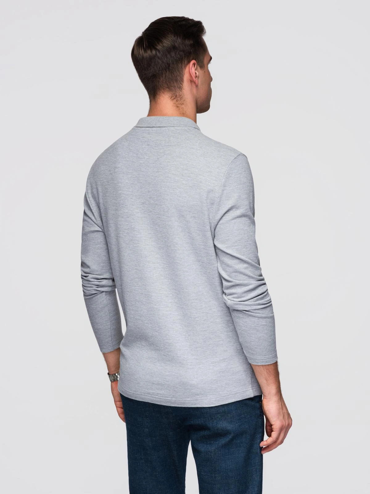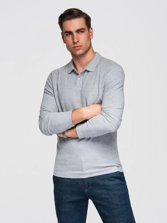 Męski longsleeve z kołnierzykiem polo BASIC – szary melanż V4 OM-POBL-0162