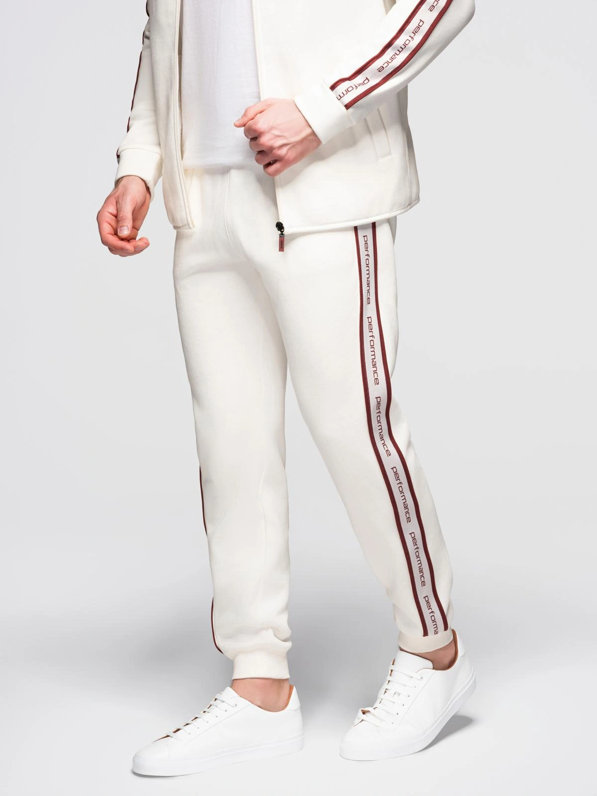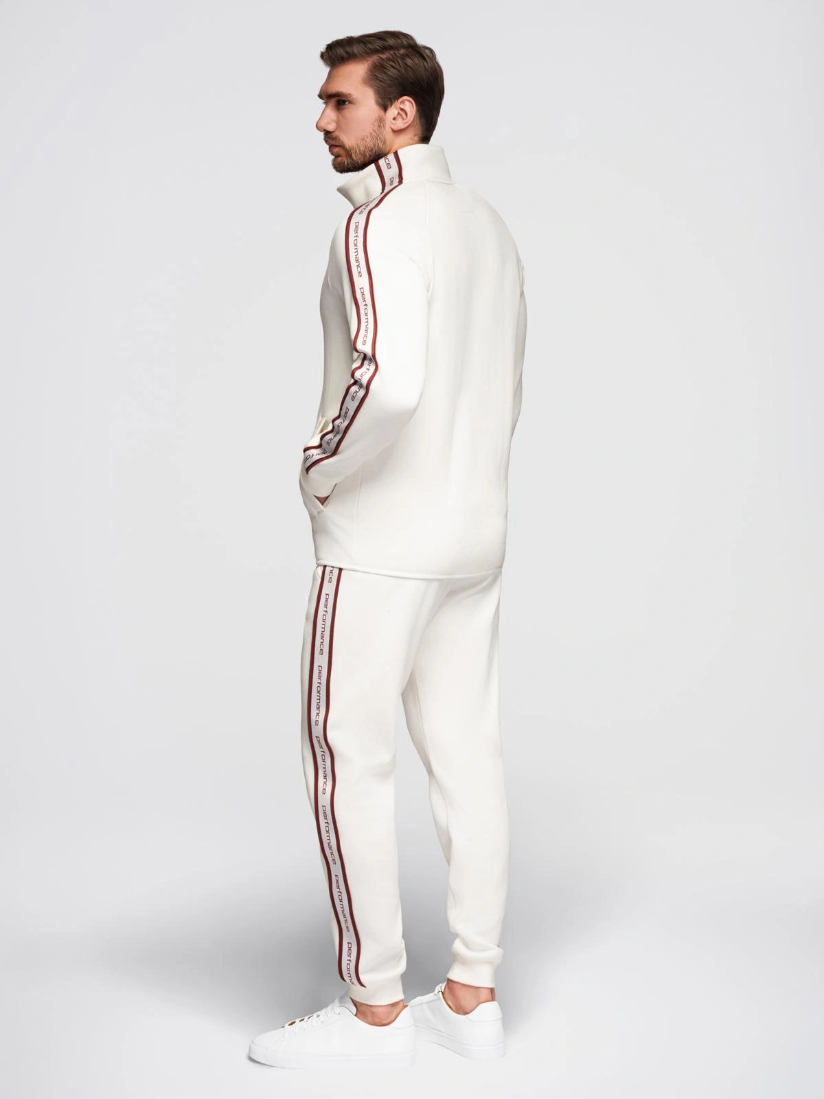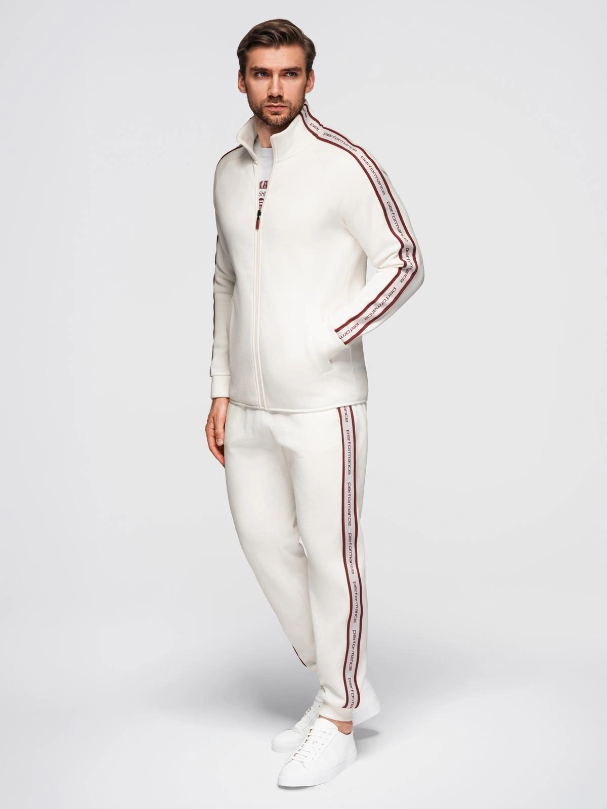 Męski komplet dresowy z linii Performance: bluza rozpinana na całej długości ze stójką i reglanowym rękawem oraz spodnie typu jogger o kroju regular. Dzianina wktórej wewnętrzna strona wykończona jest wydrapaną pętelką zwiększa to miękkość i komfort noszenia. Bluza ma dwie boczne kieszenie i zamek z brandowaniem. Spodnie posiadają boczne kieszenie oraz tylną kieszeń wpuszczaną. W obu częściach zastosowano brandowane, kontrastowe lampasy. Spodnie ściągacz w pasie i ściągacze przy nogawkach.