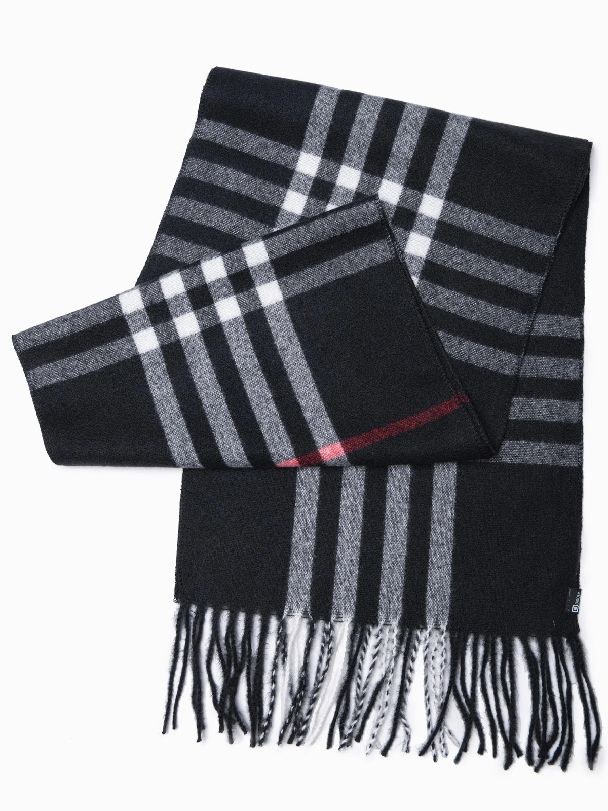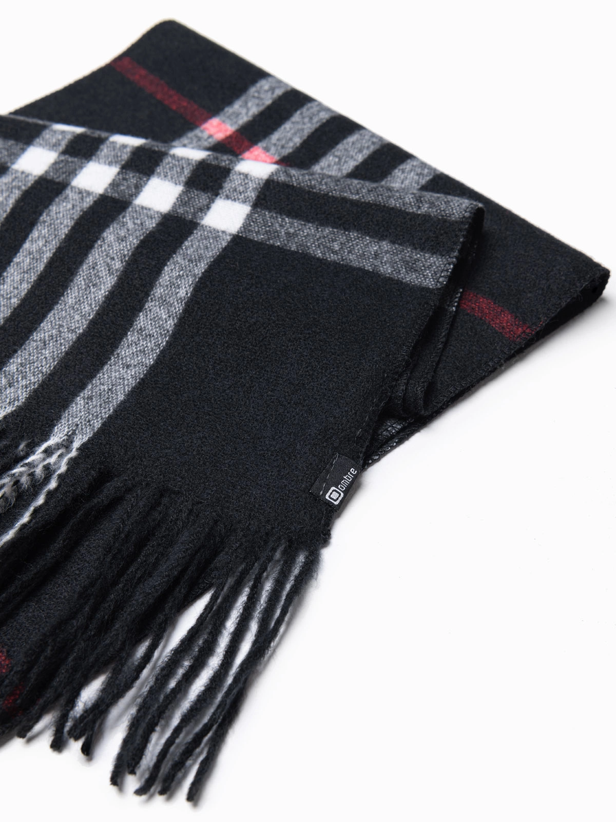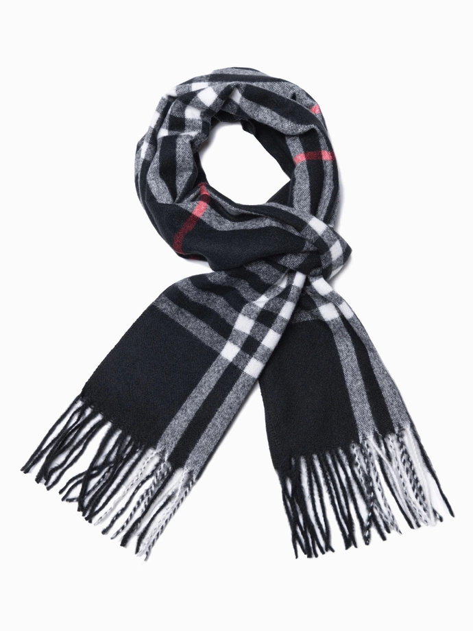 Jesienno-zimowy szalik w wyrazistą kratę. Szeroki i dość długi wykonany z miękkiej, mięsistej tkaniny. Można zawiązać go klasycznie wokół szyi lub zawinąć w artystycznym nieładzie.