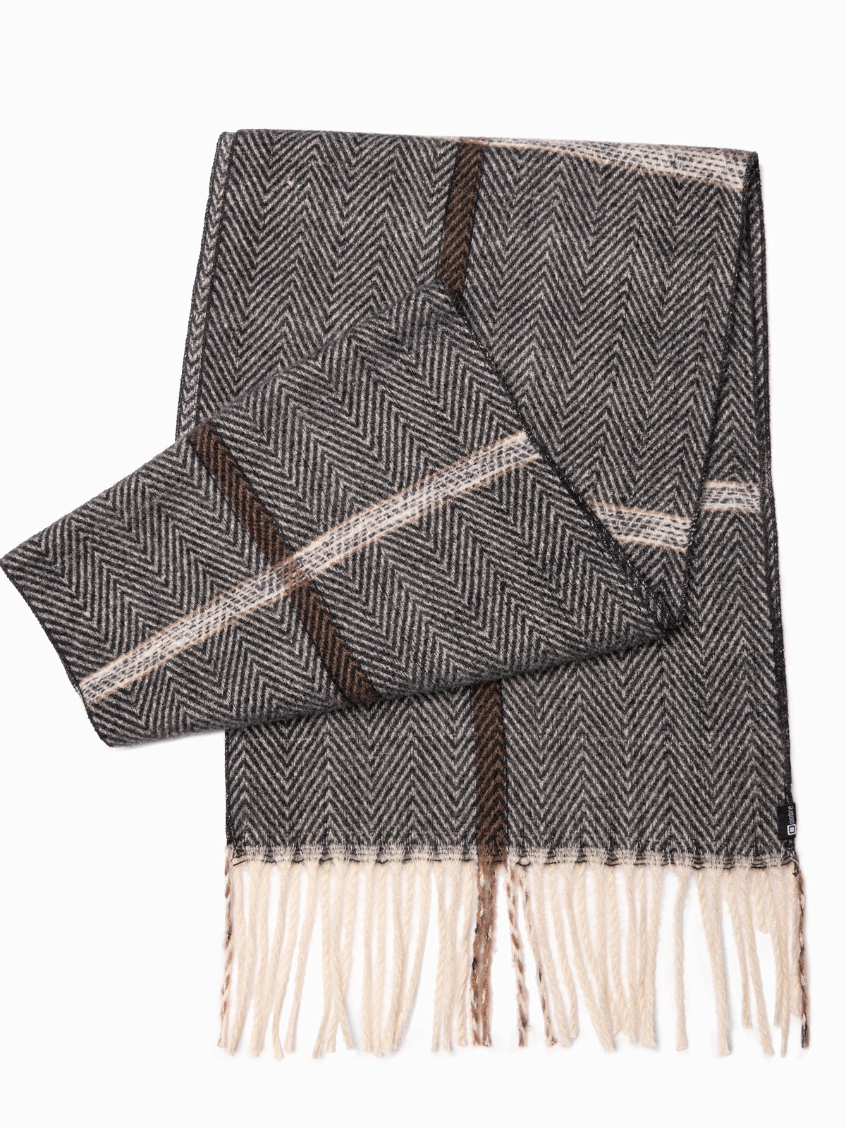 Jesienno-zimowy szalik w wyrazistą kratę. Szeroki i dość długi wykonany z miękkiej, mięsistej tkaniny. Można zawiązać go klasycznie wokół szyi lub zawinąć w artystycznym nieładzie.