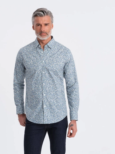 Koszula męska SLIM FIT w print drobnych liści - jasnoniebieska V1 OM-SHPS-0163