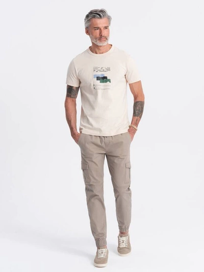 Męskie spodnie JOGGERY z zapinanymi kieszeniami cargo - beżowe V2 OM-PAJO-0123