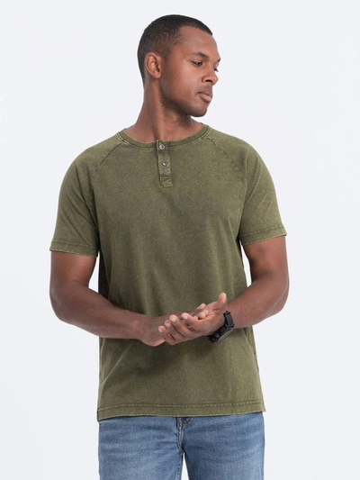 T-shirt męski z dekoltem henley - ciemnooliwkowy V4 S1757