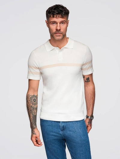 Męska koszulka polo z miękkiej dzianiny z kontrastowymi pasami - kremowa V3 OM-POSS-0118